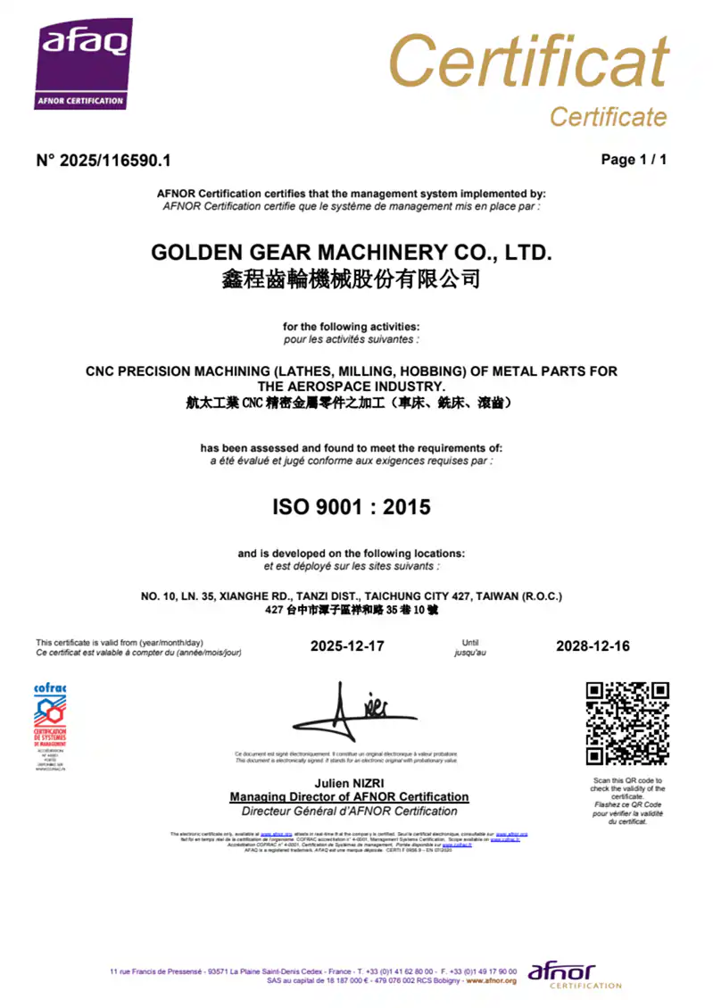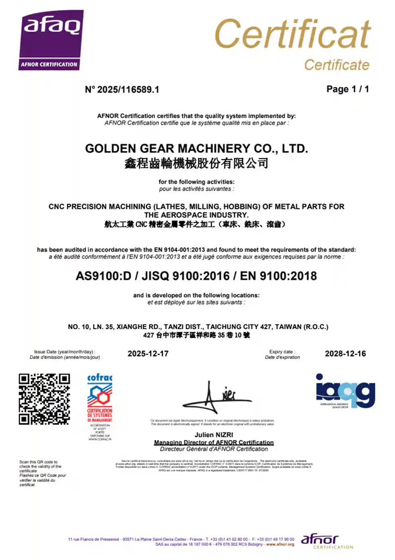 注目すべきは、Golden Gear が最近 AS 9100 国際航空品質管理認証 を取得したことです。これは、当社の品質管理システムが航空宇宙産業における世界最高水準を満たしていることを示すだけでなく、高精度ギアおよび伝動ソリューション分野における当社の専門性と信頼性を強調するものです。この認証により、国際標準に準拠した高品質な製品を安定的に提供し、さらに顧客の信頼を獲得することができます。